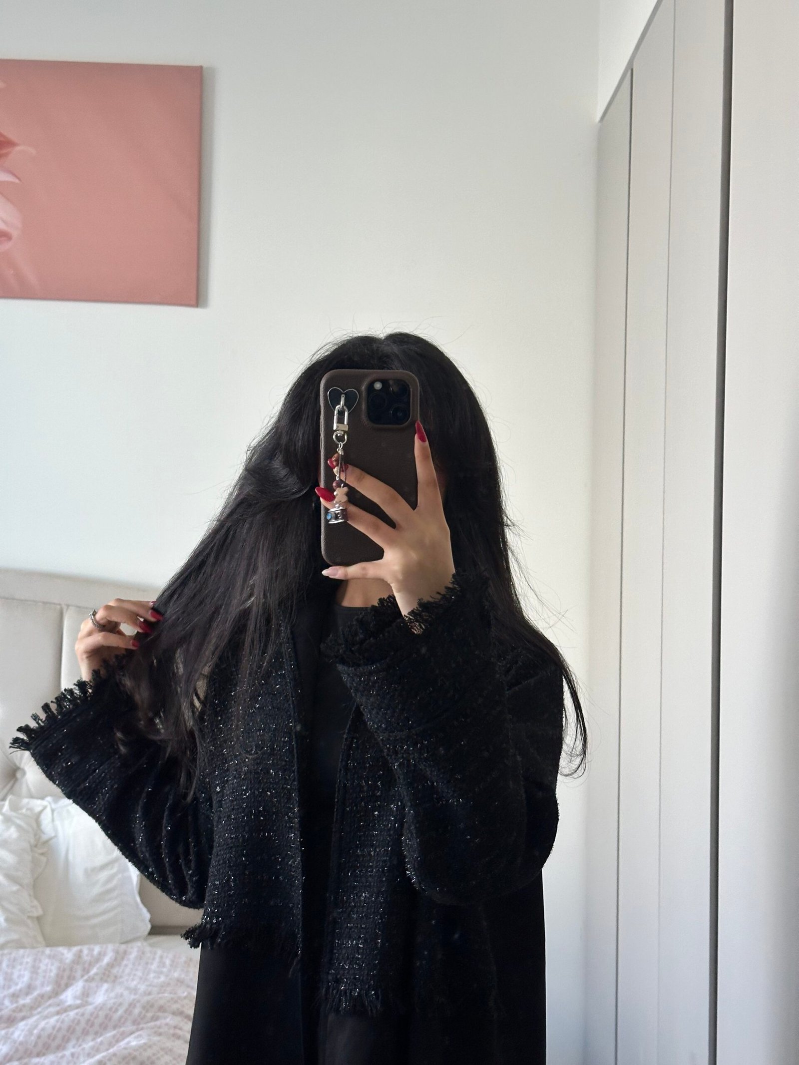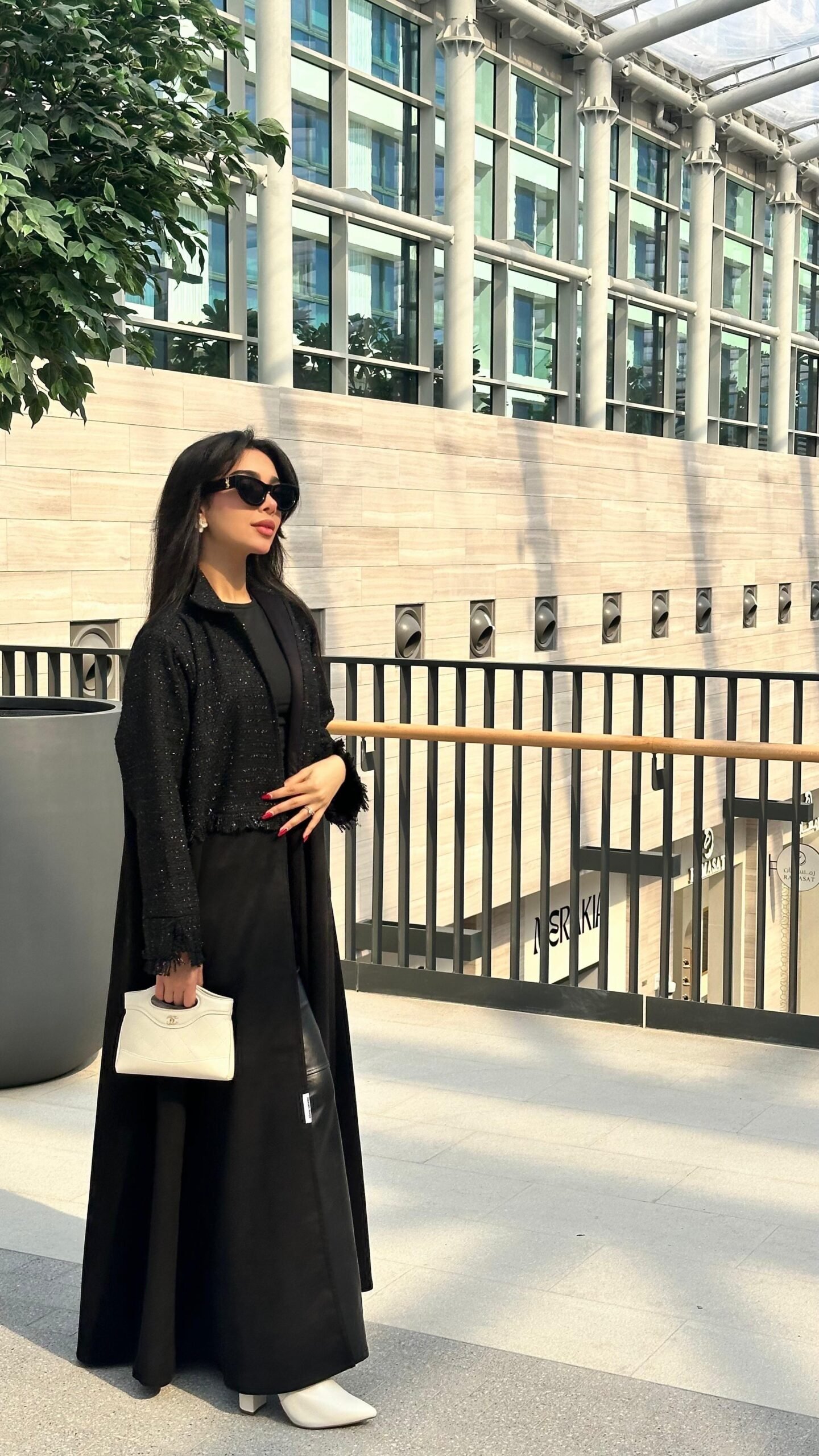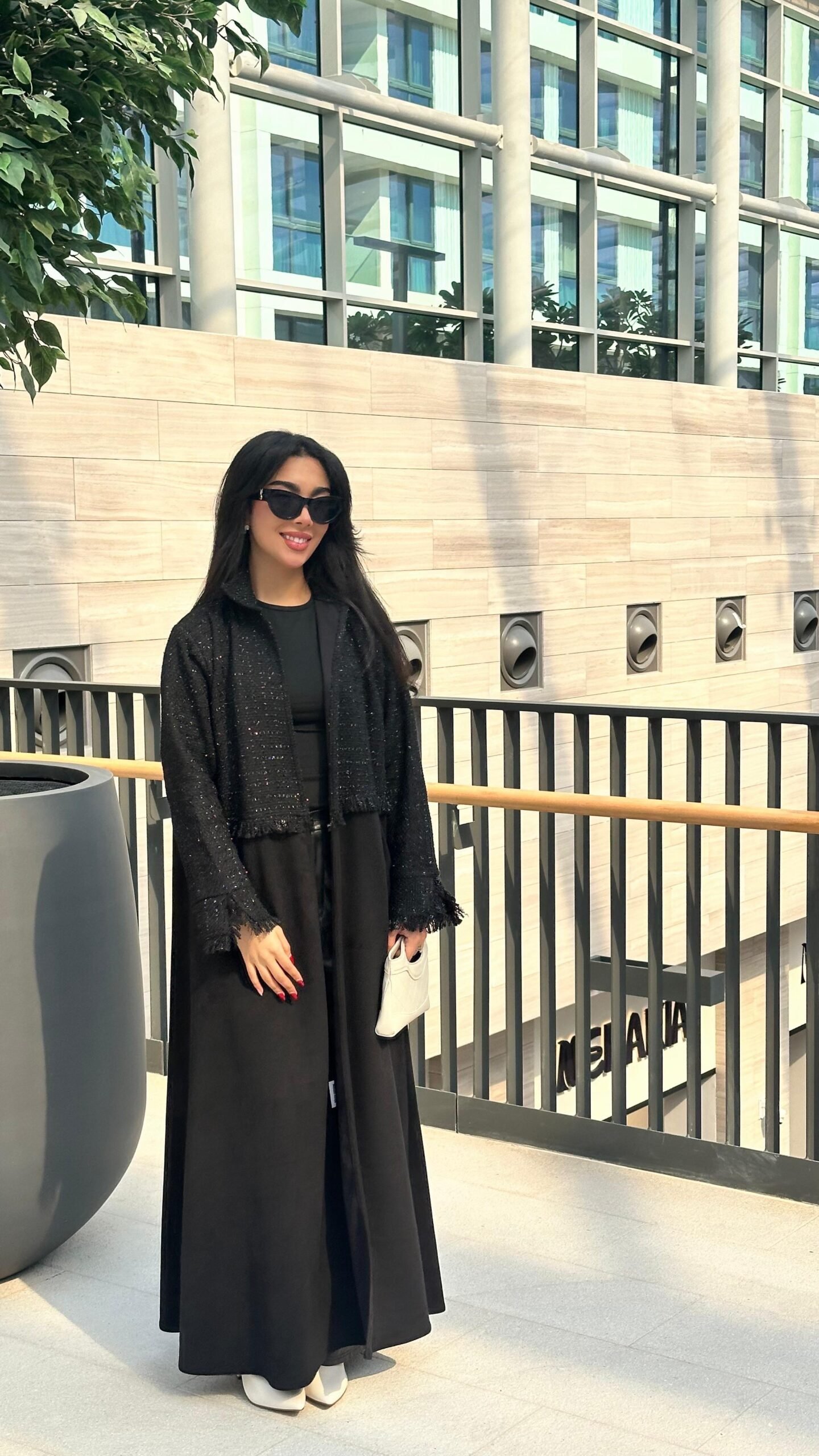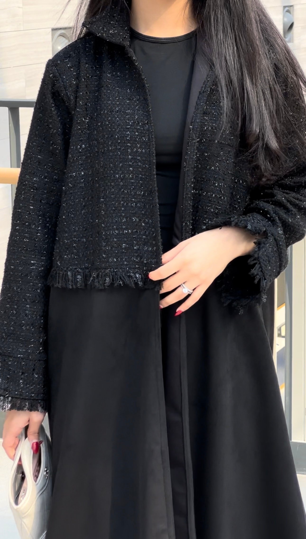An abaya made of suede fabric, with the addition of Chanel fabric in an elegant and distinctive way