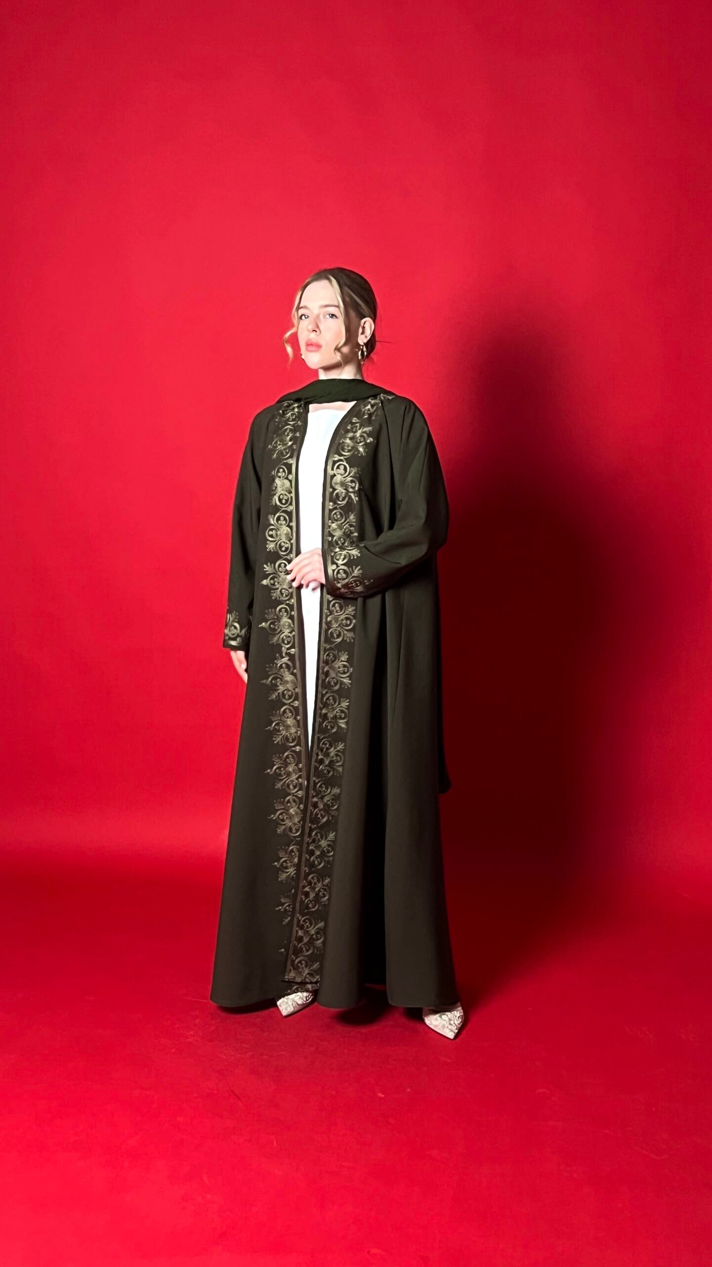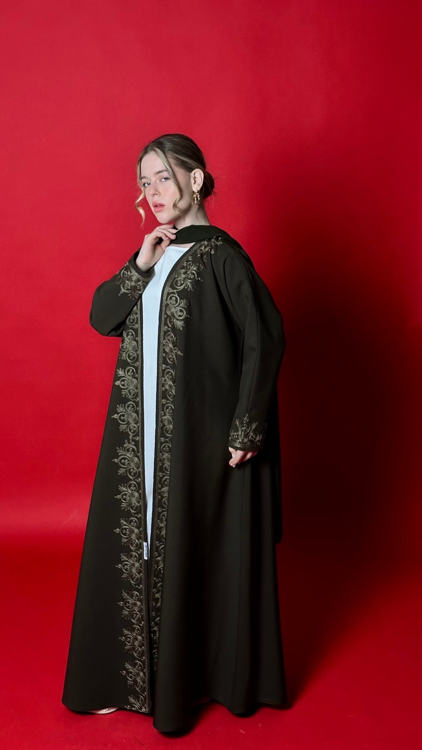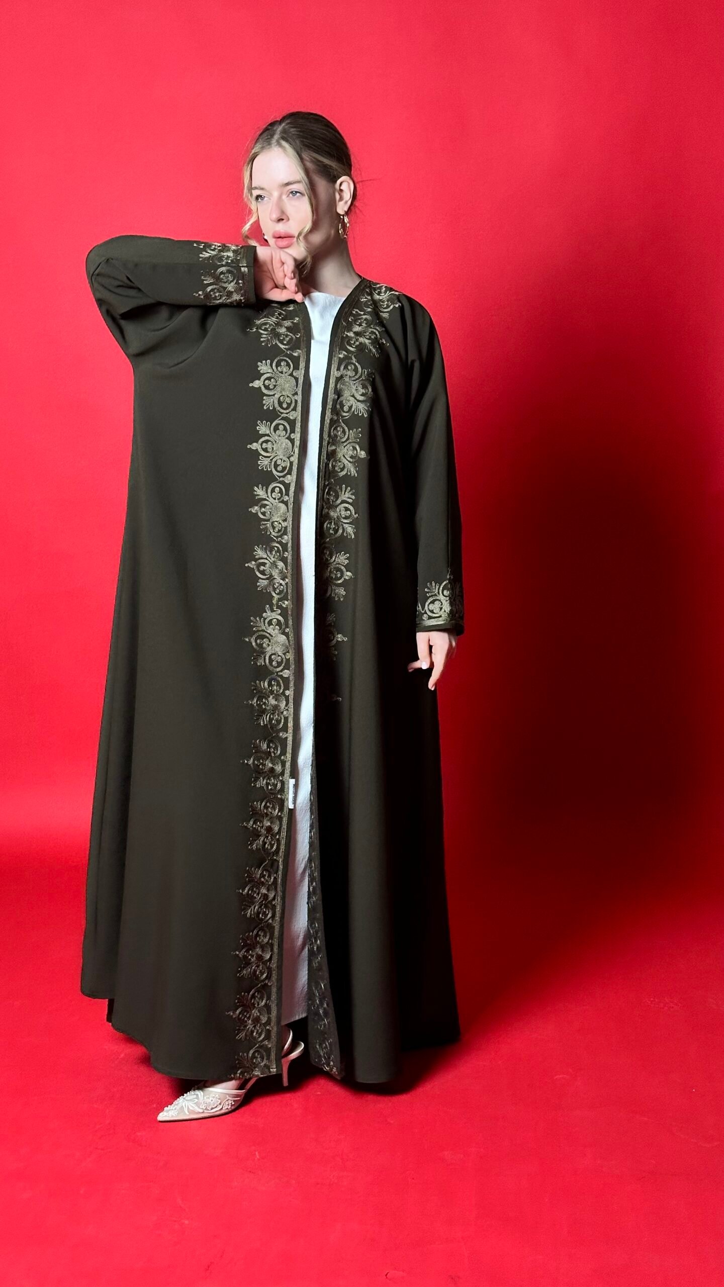 An olive-colored abaya with distinctive embroidery, featuring an elegant cloche design that suits all body types