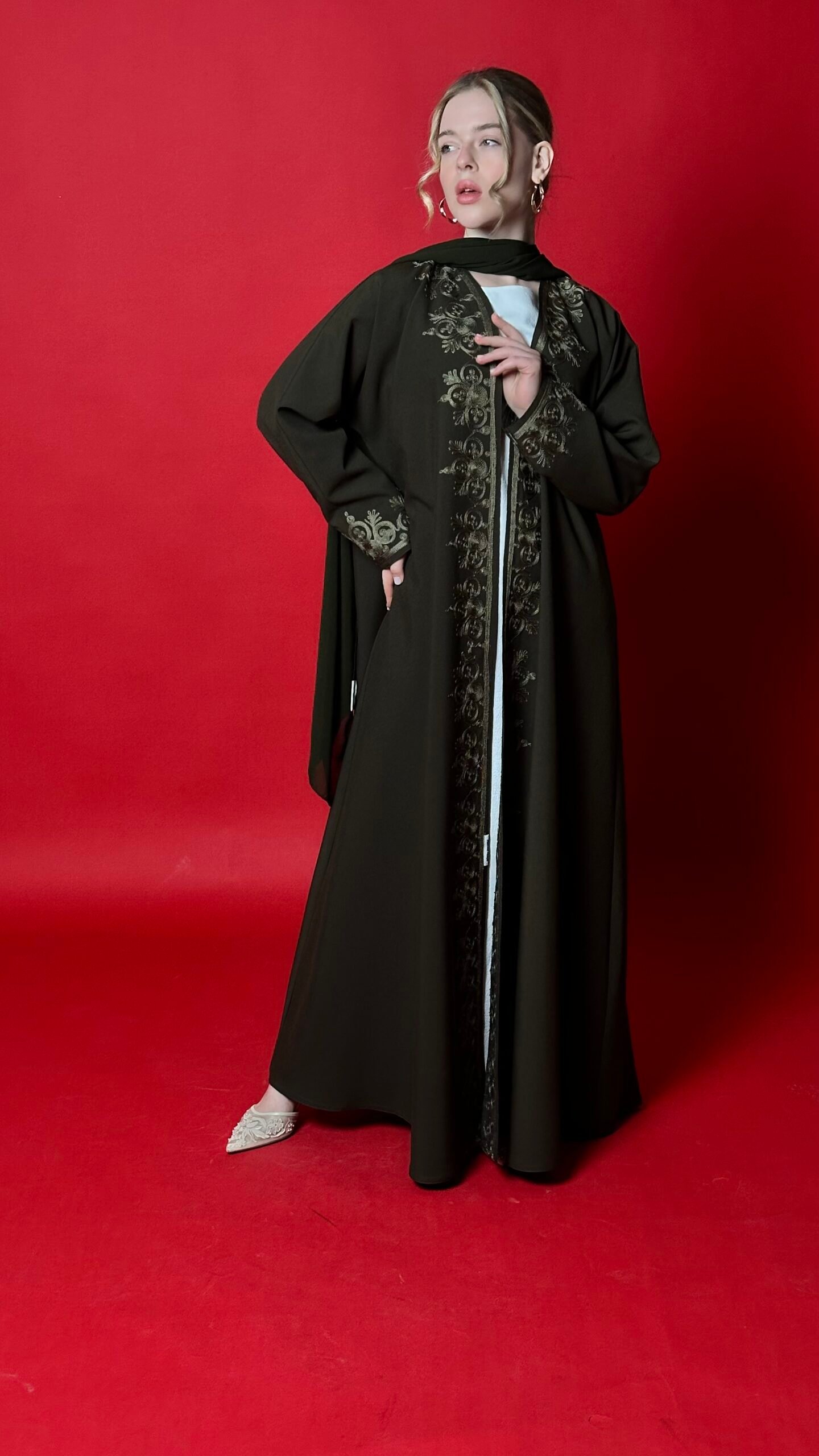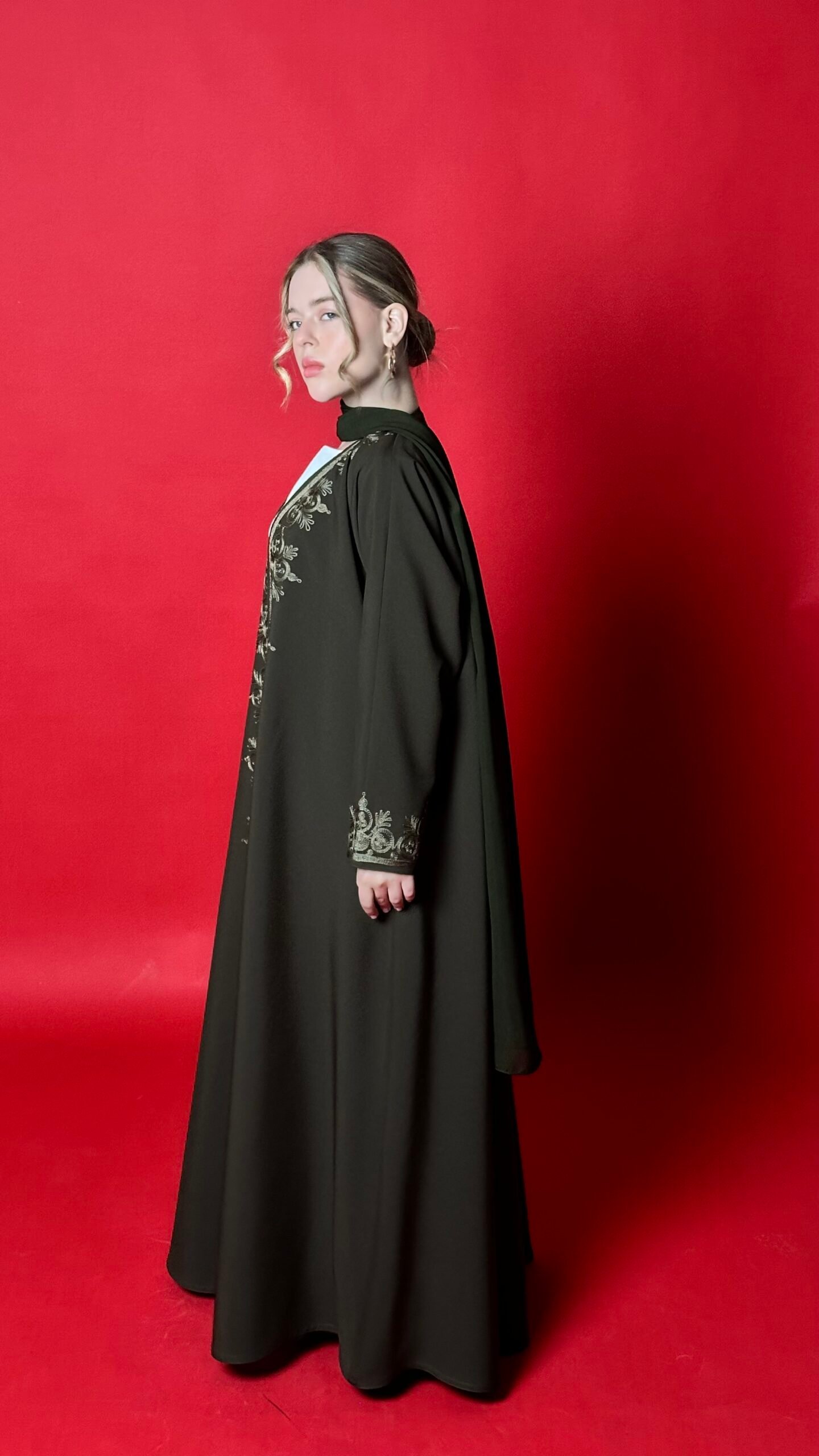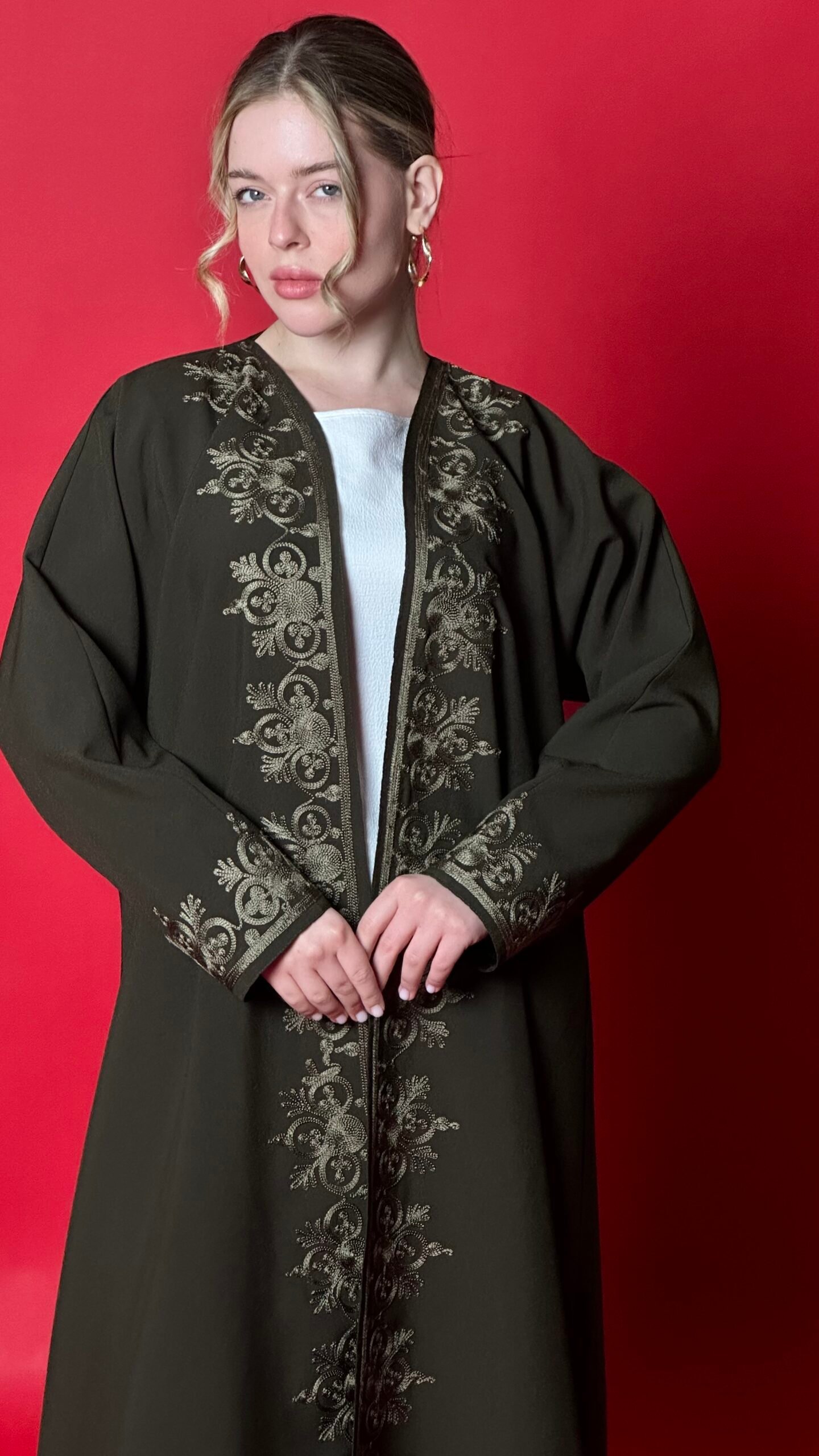 An olive-colored abaya with distinctive embroidery, featuring an elegant cloche design that suits all body types